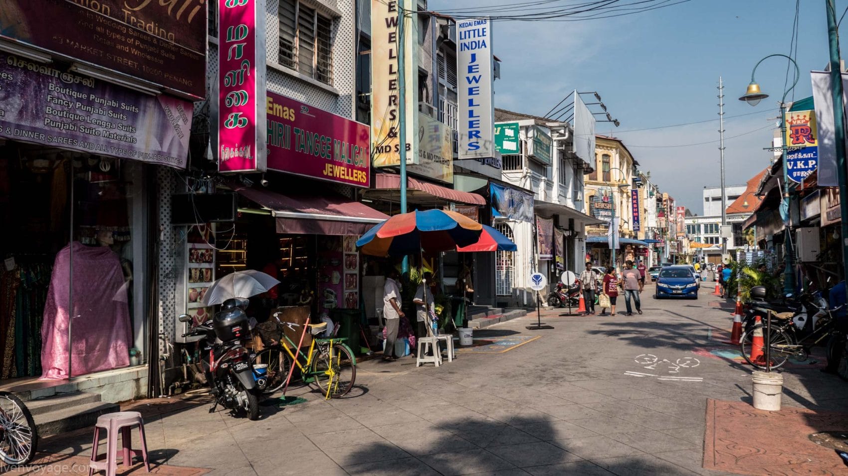 De nombreuses boutiques bordent le quartier. Elles apportent de la couleur dans les rues de George Town. Sur votre chemin, vous trouverez des magasins de mode, de tissus (soie, coton), de bijoux fantaisie, mais aussi de décorations florales, d’épices et de DVD des derniers films bollywoodiens.