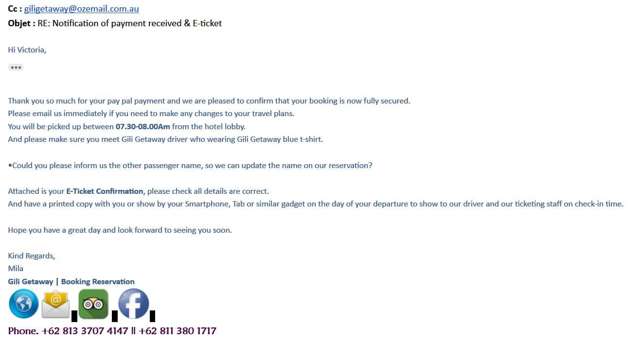 Une fois la réservation confirmée, un mail vous est envoyé dans les 24 heures pour organiser le rendez-vous avec le chauffeur de taxi. Exemple : vous serez pris en charge dans le hall de votre hôtel entre 07h30 et 08h00, le chauffeur sera vêtu d’un t-shirt bleu avec l’inscription « Gili Getaway ».
