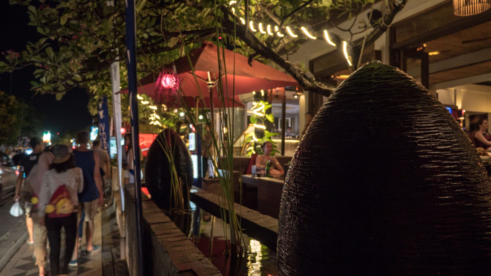 Le soir, les bars et restaurants en bord de plage montrent une ambiance chaleureuse et estivale. Des tables et des poufs sont disposés à même le sable. Chaque emplacement possède un parasol coloré (rouge, bleu, vert, jaune, orange…) qui s’allume la nuit. C’est même très joli à voir de loin si vous faites une balade sur la plage le soir au nord de Kuta Beach.