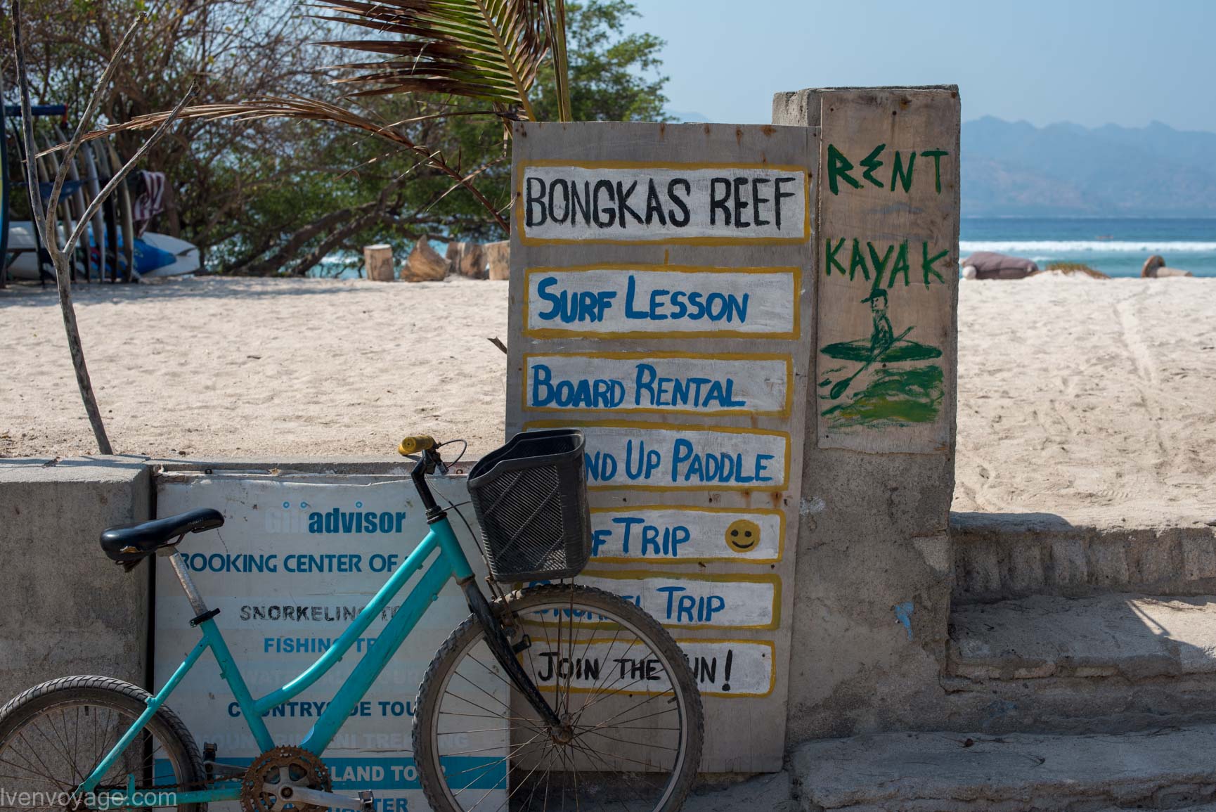 Au delà de la colline à gravir, ce qui est vraiment sympa à faire sur Trawangan et gratuitement, c’est le tour de l’île. A pied, vous mettez environ 3 heures tandis qu’à vélo, vous pédalez pendant presque 1 heure. D’ailleurs, c’est là que vous verrez les différences entre les parties (nord, sud, est, ouest) de l’île. C’est un régal, ne le faisions pratiquement tous les jours.