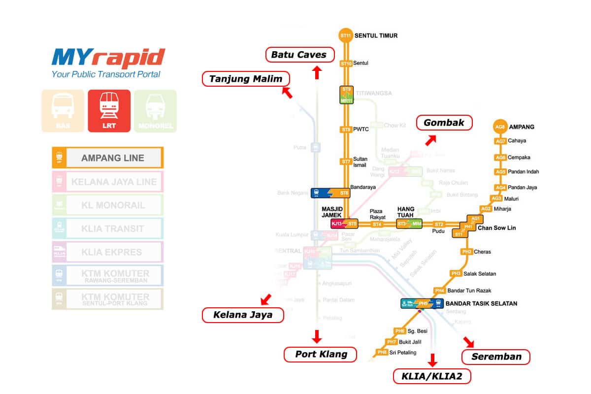 La ligne Ampang est divisée en deux destinations. Les routes commencent à la station Sentul Timur dans le nord de Kuala Lumpur. La première se termine à Sri Petaling dans le sud, tandis que la seconde s’achève à Ampang dans la banlieue est de la ville. Cette ligne est pratique si vous souhaitez aller à Putra World Trade Center ou bien à Masdjid Jamek (Central Market) et PlazaRayat, deux gares très fréquentées par les visiteurs.
