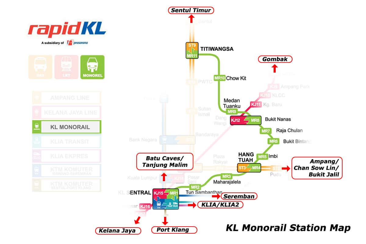Les transferts avec le métro de Kuala Lumpur sont possibles aux stations Bandar Tasik Selatan ou Bank Negara pour la ligne Ampang, et à la station KL Sentral pour la ligne Kelana Jaya.